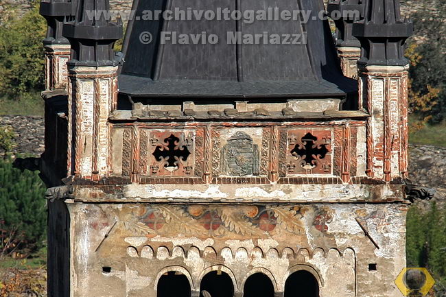 Particolarità dell'esterno della facciata Sud del campanile di San Giusto, da notare il fregio dipinto a foglie di rovere e pomi.